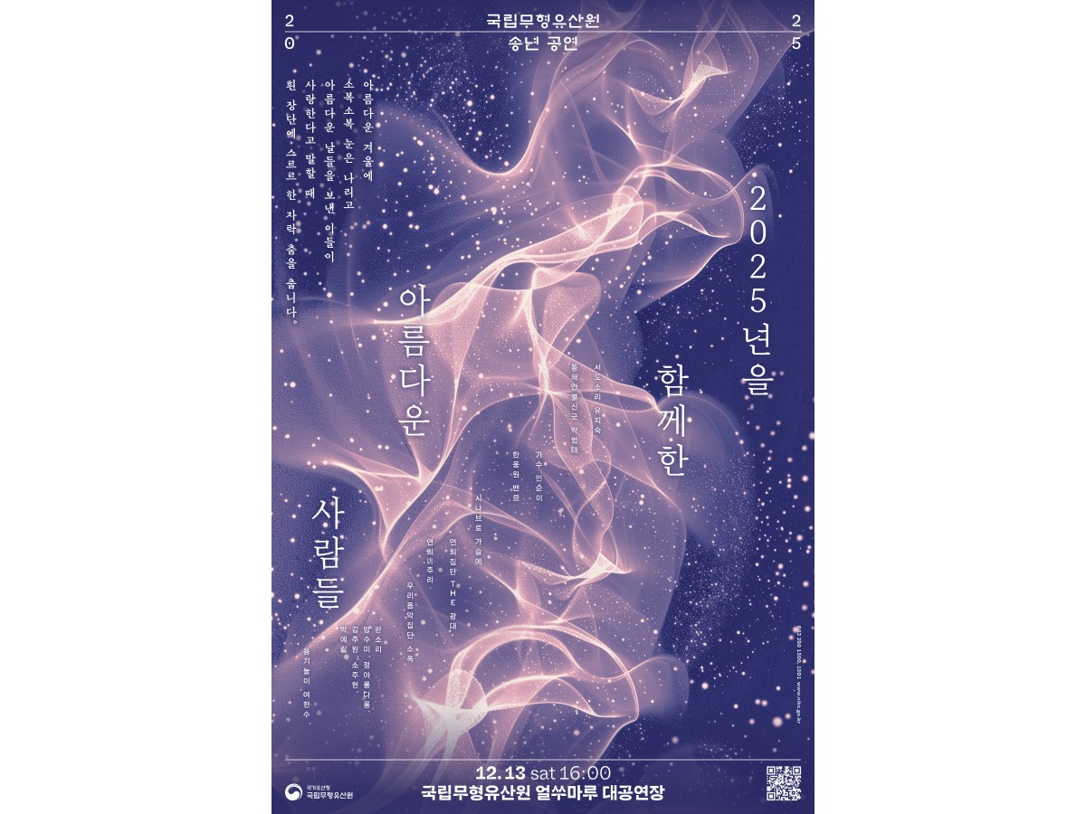 국가유산청 국립무형유산원(원장 박판용)은 12월 13일(토) 오후 4시, 국립무형유산원 얼쑤마루 대공연장(전북 전주시)에서 올 한 해 공연을 마무리하며 관객들에게 감사의 마음을 전하는 송년공연 <2025년을 함께한 아름다운 사람들>을 개최한다.