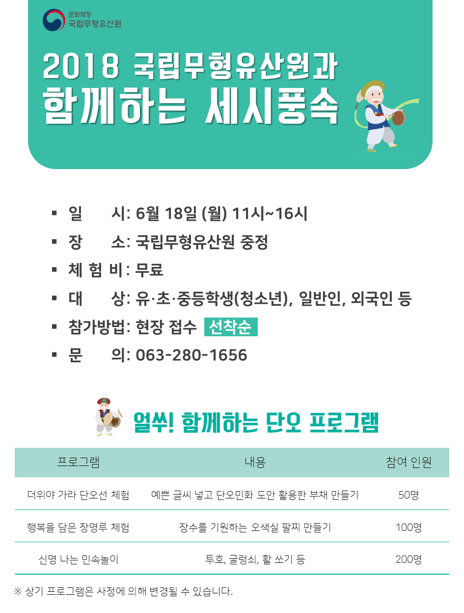 국립무형유산원과 함께하는 세시풍속 단오 체험 프로그램이 단옷날(6월 18일, 월요일)에 진행됩니다. 예쁜 글씨 넣고 단오민화 도안 활용한 부채 만들기·장수를 기원하는 오색실 팔찌 만들기와 민속놀이 체험을 통해 세시풍속 단오를 즐겨 보아요!
